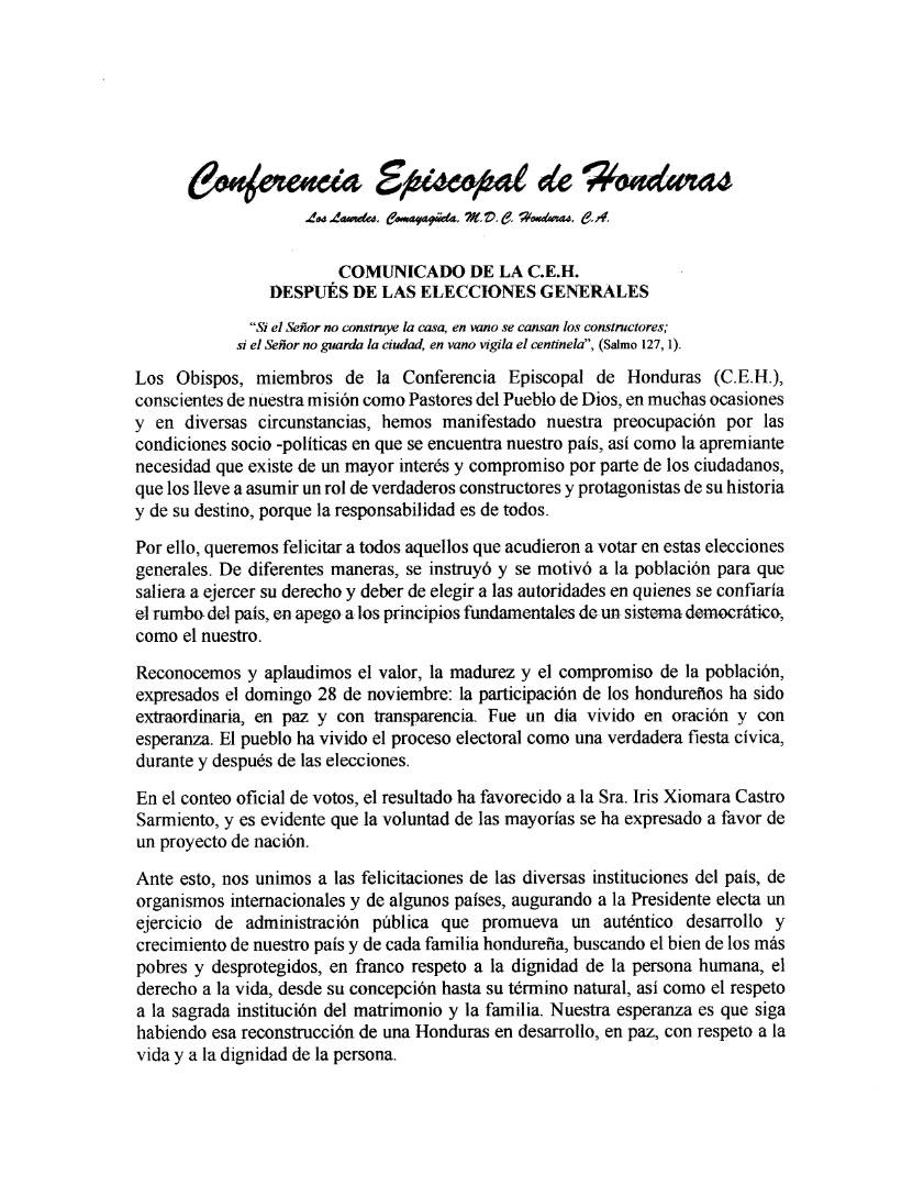 “Reconocemos y aplaudimos el valor, la madurez y el compromiso de la población, expresados el domingo 28 de noviembre: la participación de los hondureños ha sido extraordinaria, en paz y con transparencia. Fue un día vivido en oración y con esperanza. El pueblo ha vivido el proceso electoral como una verdadera fiesta cívica, durante y después de la elecciones”, destaca el comunicado leído por el sacerdote Juan Ángel López, portavoz de la CEH.