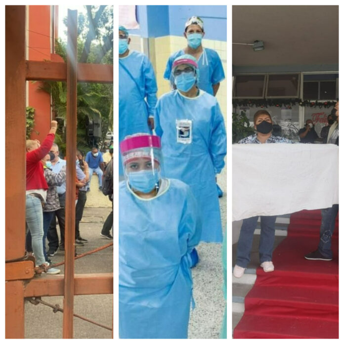 Los manifestantes entre ellos médicos, personal de enfermería, laboratoristas entre otros exigen a las autoridades les paguen su salario.