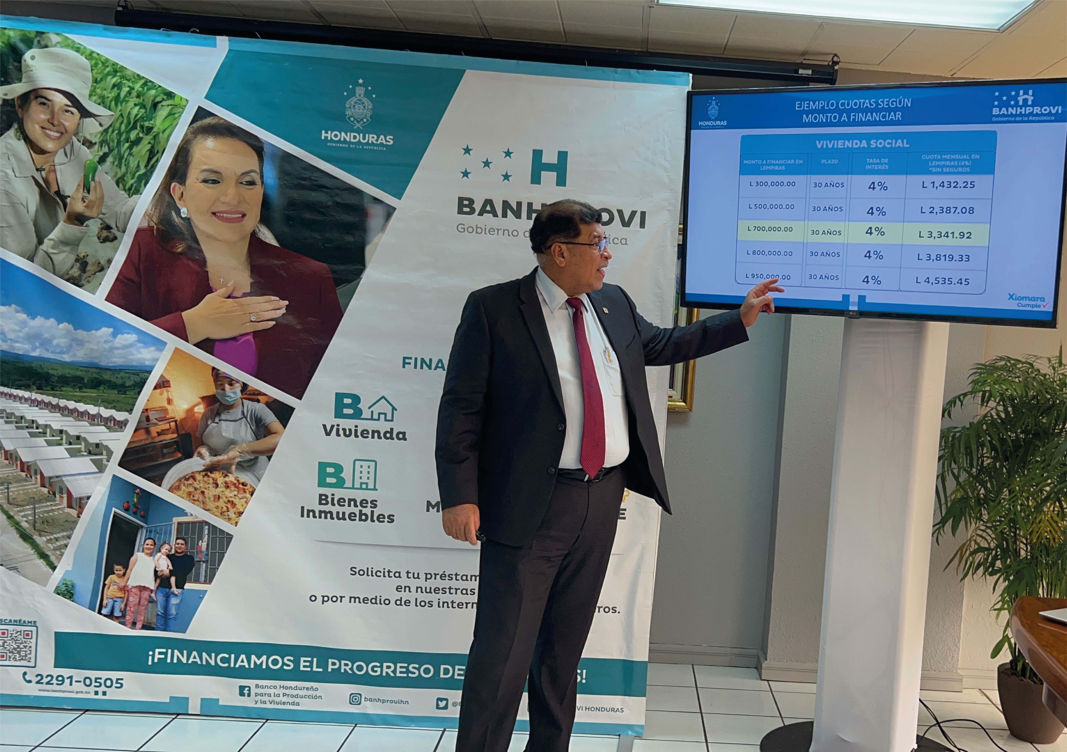 Destacó que la banca privada pide el 10 % de prima, sobre el total del valor de la vivienda, mientras que el Banhprovi financiará el 100 % de la prima.