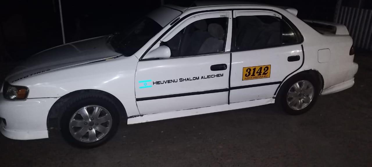 Un vehículo, marca toyota, tipo turístico, color blanco tipo taxí.