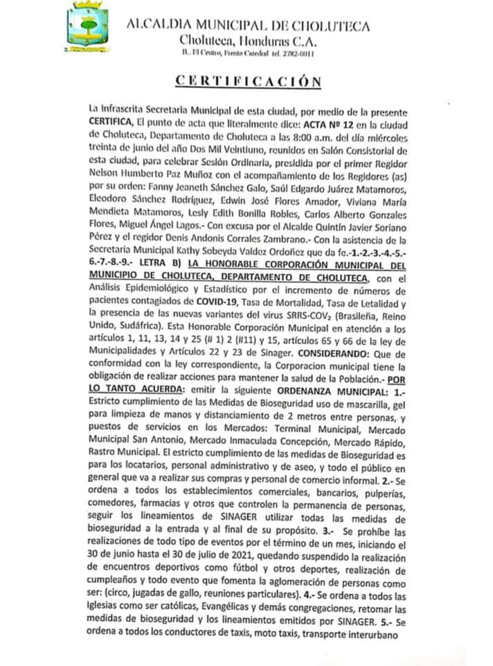 ALCALDIA DE CHOLUTECA EMITE ORDENANZA POR AUMENTO DE CASOS COVID-19