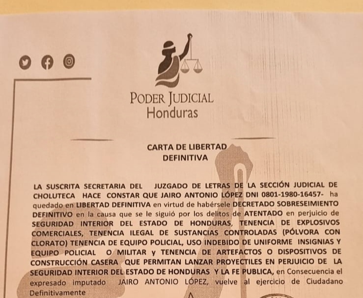 Choluteca, 5 de octubre de 2024 — En un acto de trascendencia para la libertad de prensa y los derechos humanos, el periodista Jairo Antonio López recibió hoy su carta de libertad definitiva, en el marco de la amnistía política otorgada a personas perseguidas por razones políticas en Honduras. Este hecho marca el fin de un proceso de más de cinco años de lucha por su libertad y justicia.
