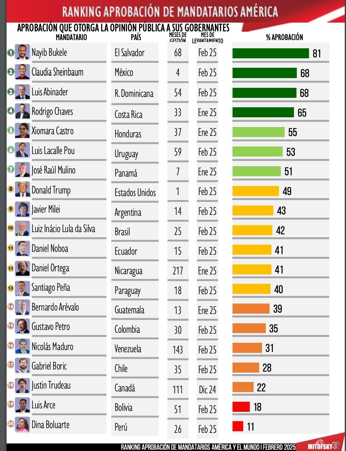 La Presidenta Xiomara Castro se encuentra entre los primeros cinco mandatarios con mejor aprobación de América, según la encuesta Mitofsky del mes de febrero publicada por el sitio DatoWorld.