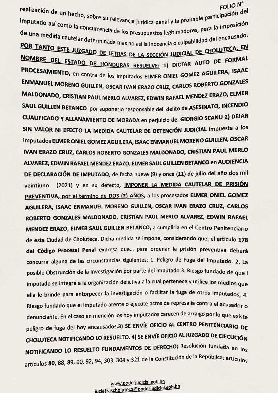 En resolución de Audiencia Inicial, Juzgado Penal de Choluteca dicta Auto de Formal Procesamiento con Prisión Preventiva contra 7 acusados de Incendio Cualificado, Asesinato y Allanamiento de Morada contra un ciudadano de origen italiano.