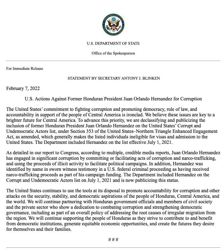 El compromiso de los Estados Unidos con la lucha contra la corrupción y la promoción de la democracia, el estado de derecho y la rendición de cuentas en apoyo de los pueblos de América Central es férreo. Creemos que estos temas son clave para un futuro más brillante para Centroamérica. Para avanzar en esta prioridad, estamos desclasificando y publicitando la inclusión del ex presidente hondureño Juan Orlando Hernández en la lista de Actores Corruptos y Antidemocráticos de los Estados Unidos, bajo la Sección 353 de la Ley de Compromiso Mejorado de los Estados Unidos-Triángulo Norte, según enmendada, que generalmente hace que las personas incluidas en la lista no sean elegibles para visas y admisión a los Estados Unidos. El Departamento incluyó a Hernández en la lista a partir del 1 de julio de 2021.